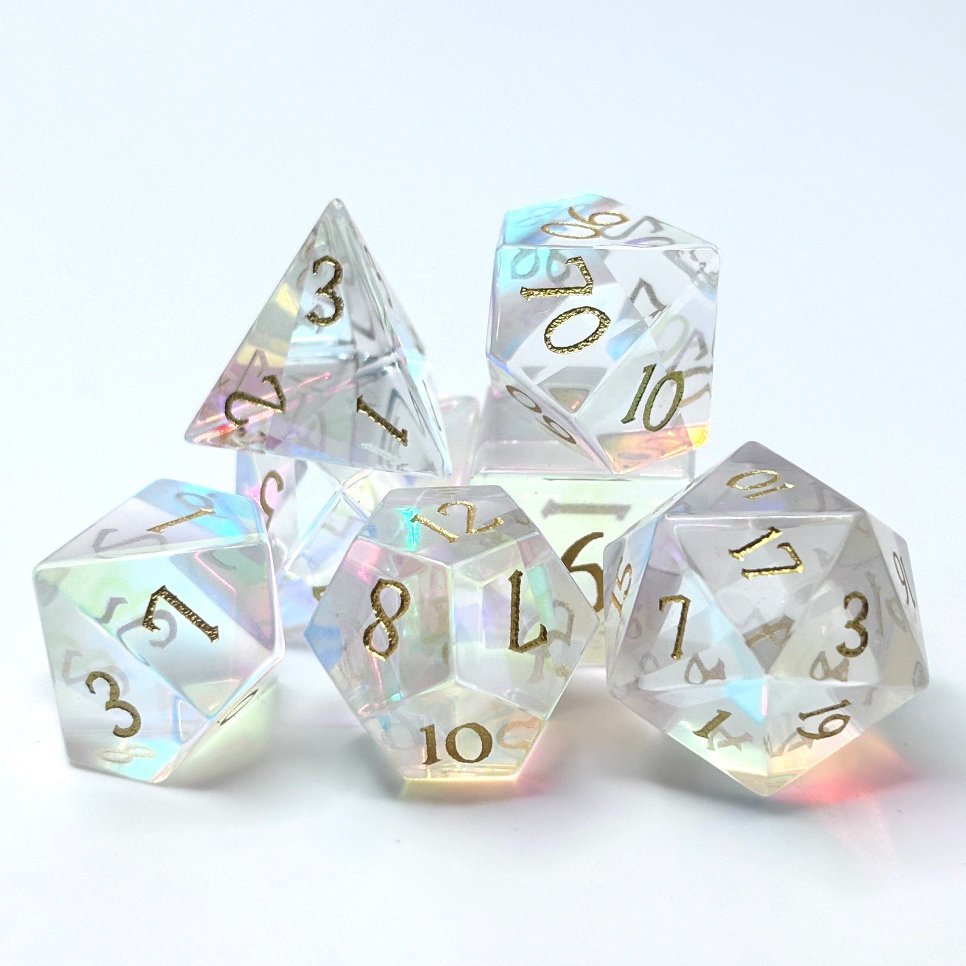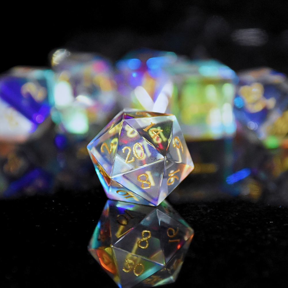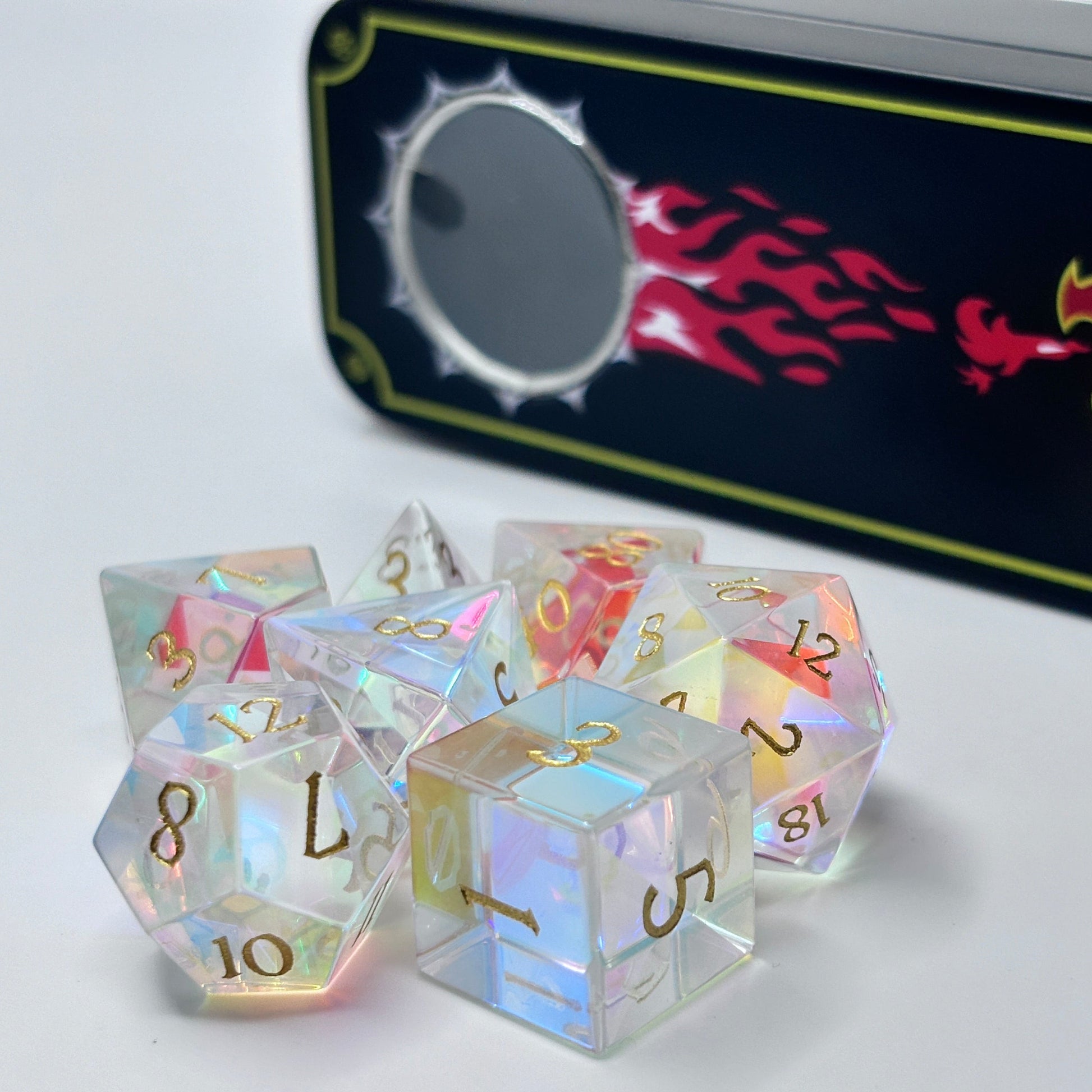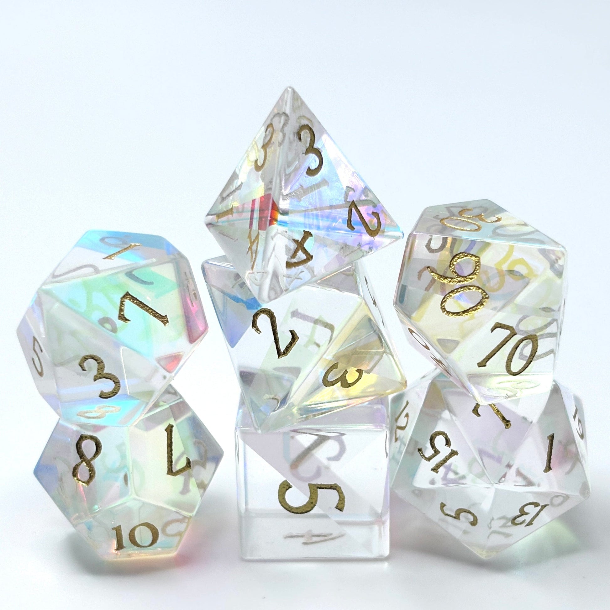 Get ready to roll in style with these dazzling glass D&D dice, where vibrant colors swirl like magic inside each crystal-clear die! Every roll is a mini spectacle, adding a touch of elegance and enchantment to your tabletop battles!